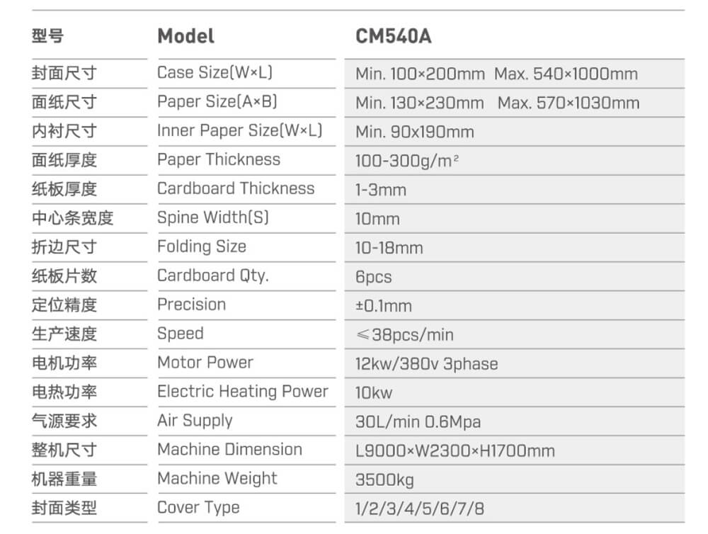 飞达送面纸、上胶,飞达送纸板,面纸与纸板定位粘合,四边包边一次完成。其具有生产速度快、需要人工少、成品美观精致、机械手影像定位装置,精准定位,提高精度等特点。可以广泛应用于制作精装书封面、酒包皮壳、烟包皮壳、笔记本、文件夹、台历、挂历等。